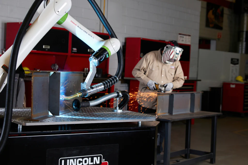 Tecnología de soldadura robótica: Robot FANUC® CRX con fuente Power Wave® R450 y alimentador AutoDrive® 4R100 para control preciso y alta versatilidad.